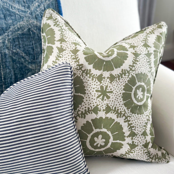 Cushion in olive 'Margot' fabric with self piping. Same fabric front & back.