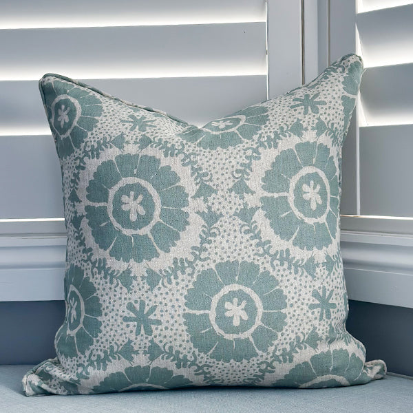 Cushion cover in duck egg blue 'Margot', on oatmeal linen with self piping. Same fabric front & back. 2 available.